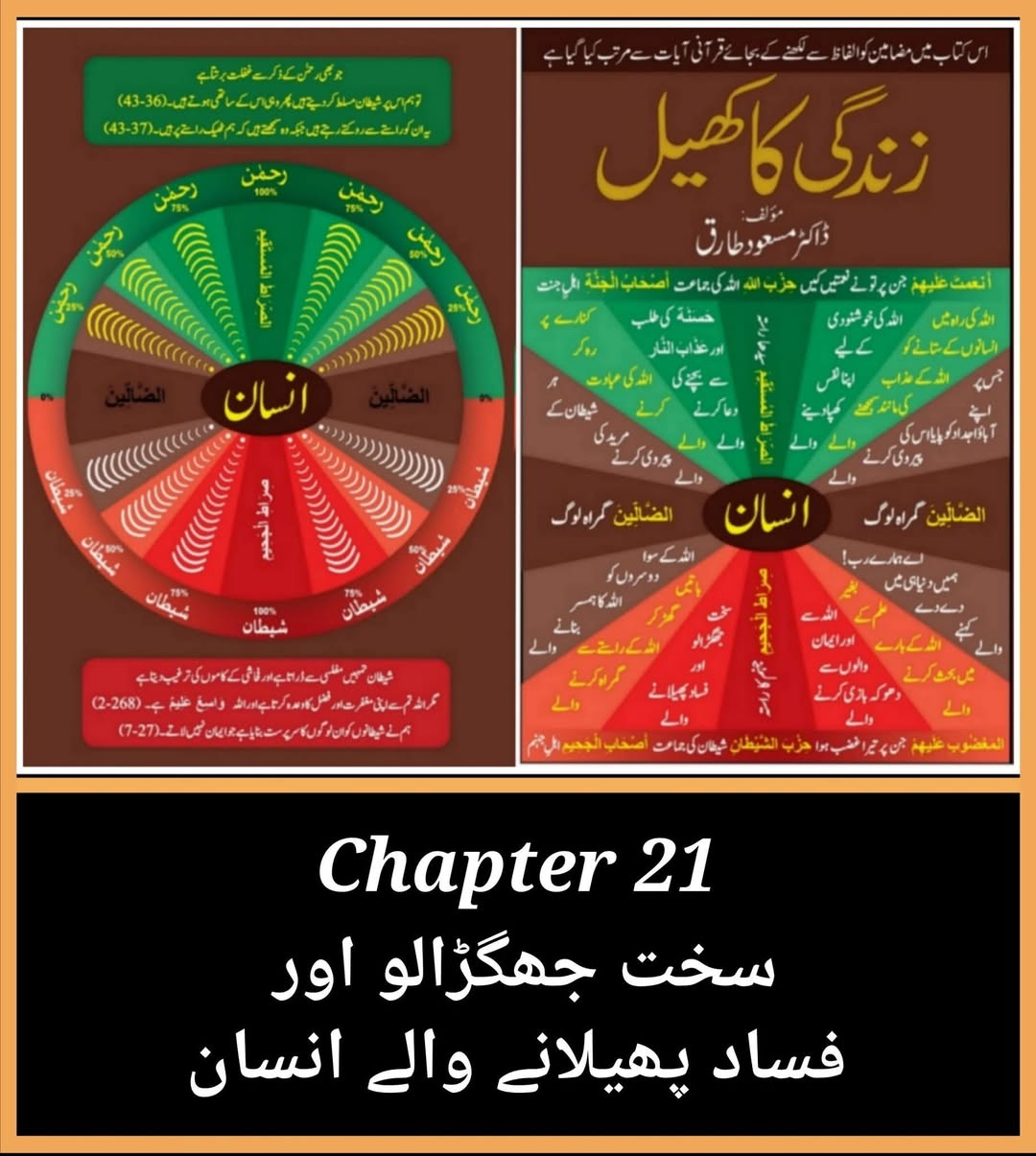اے انسانوں ! اپنے رب سے تعلق قائم کرو جس نے تم کو واحد نفس سے تخلیق کیا اور اسی میں سے تمہارے جوڑے تخلیق کیے اور اسی میں سے کثرت سے مرد اور عورتیں پھیلا دیے۔ سو تعلق قائم رکھو الله سے جس سے مدد طلب کرتے ہو اور خونی رشتہ داروں سے۔ بیشک الله تم پر ہر وقت نگراں ہے۔ (1-4) الله حکم دیتا ہے عدل کا اور احسان کا اور دیتے رہنے کا قرابت داروں کو اور منع کرتا ہے فحاشی سے اور منکر کاموں سے اور سرکشی سے اور تم کو نصیحت کرتا ہے تاکہ تم یاد رکھو۔ (90-16) اور جو الله نے تجھے دے رکھا ہے اس میں سے آخرت کا گھر طلب کر اور دنیا میں سے اپنا حصہ فراموش نہ کر اور بھلائی کر جیسے الله نے تیرے ساتھ بھلائی کی ہے اور زمین میں فساد مچانے کی کوشش نہ کر۔ بیشک الله فساد کرنے والوں کو پسند نہیں کرتا۔ (77-28) مثال ان لوگوں کی جو اپنا مال الله کی راہ میں خرچ کرتے ہیں ایسی ہے جیسے ایک دانہ اگائے سات بالیں اور ہر بالی میں سو دانے ہوں اور الله جس کے لیے چاہتا ہے زیادہ کرتا ہے اور اللہ وَاسِعٌ عَلِيم ہے۔ (261-2) جو لوگ اپنا مال الله کی راہ میں خرچ کرتے ہیں پھر اس کے بعد وہ نہ اس خرچ کا احسان جتاتے ہیں اور نہ اذیت دیتے ہیں۔ ان کا اجر ان کے رب کے پاس ہے اور ان کے لیے کوئی خوف نہیں ہے اور نہ وہ غمگین ہوں گے۔ (262-2) تم لوگوں سے بات کرتے ہوئے اپنے گال مت پُھلاؤ اور زمین میں اکڑ کر مت چلو۔ بیشک الله ہر اس شخص کو پسند نہیں کرتا جو خود پسند اور فخر کرنے والا ہو۔ (18-31) ایک معروف قول اور در گذر کرنا زیادہ خَيْر والا ہے اس صدقہ سے جس کے دینے کے بعد اذیت دی جائے اور الله غَنِيٌّ حَلِيم ہے۔ (263-2) تو کیا تم سے توقع کی جا سکتی ہے کہ جب تم جاؤ گے تو زمین میں فساد مچاؤ گے اور آپس میں قطع رحمی کرو گے؟ (22-47) یہی ہیں وہ لوگ جن پر الله نے لعنت کی ہے اور انہیں بہرا کردیا ہے اور ان کی آنکھوں کو اندھا کردیا ہے۔ (23-47) وہ لوگ جو کفر کی راہ میں بھاگ دوڑ کر رہے ہیں بیشک یہ الله کو ذرا بھی نقصان نہیں پہنچا سکیں گے۔ الله کا ارادہ یہ ہے کہ ان کے لیے آخرت میں کوئی حصہ نہ رکھے اور ان کے لیے عَذَابٌ عَظِيم ہے۔ (176-3) شیطان نے انکو قابو میں کرلیا ہے اور الله کی یاد انکو بھلا دی ہے۔ یہی لوگ شیطان کی جماعت ہیں۔ جان لو کہ شیطان کی جماعت خسارے میں رہنے والی ہے۔ (19-58)